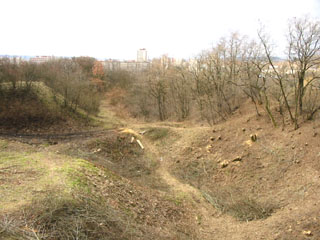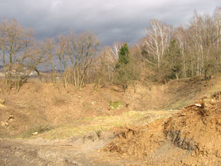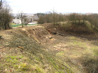 Obr. 1 Východní svah lomu na Šibeňáku – vlevo v zemi vedle paneláků bývalá ústředna. 07/03/02