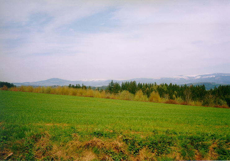 Druhý pohled na Krkonoše zachycuje východní část hor, které jsou dosud zasněžené.