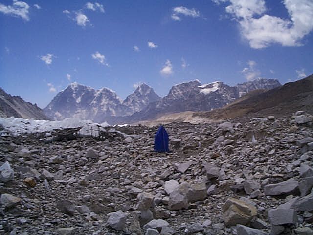 Technická realizace . Přiznám se, že na své páté himálajské expedici poprvé zažívám takový "komfort". Kadibudka. Krásná, modrá, celá z plachtoviny, vpředu na zip. Chybí jen to vyřízlé srdíčko! Je to dáno tím, že v Nepálu a zejména v oblasti Solo Khumbu začali brát vážně ekologii. V tomto případě možná až příliš vážně. Kluci totiž říkali, že už tu byl , no jak to nazvat, nosič našich osobních vzorků, který vybral plastikový rezervoár, do kterého se zdařile trefujeme. Papíry prosím zvlášť! Ale jako starý romantik musím přiznat, že sedět například pod Makalu nebo Manaslu a mít při této činnosti výhled do údolí bylo mnohem příjemnější.