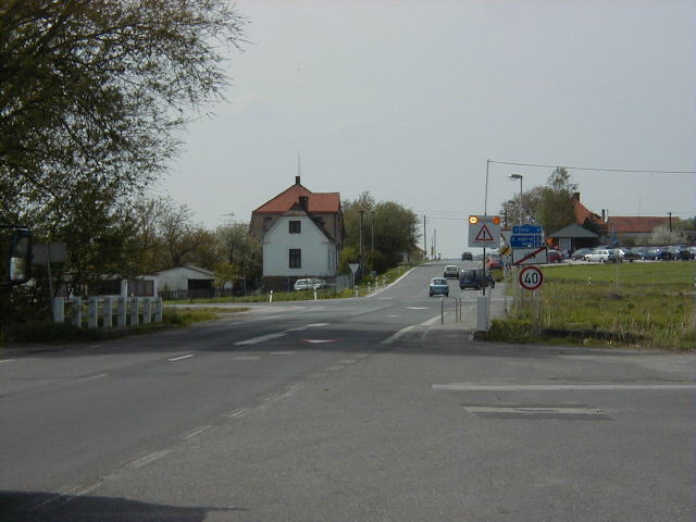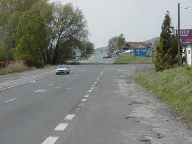 Pohled ze vzdálenosti přibl. 200 m ke křižovatce ve směru od Jičína. Foceno z odstavného pruhu. Z této vzdálenosti je zdaleka nejviditelnějším prvkem reklama vpravo u odstavné plochy.
