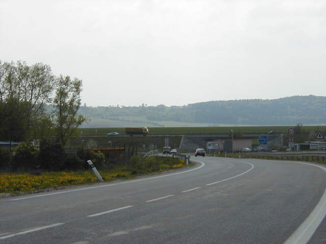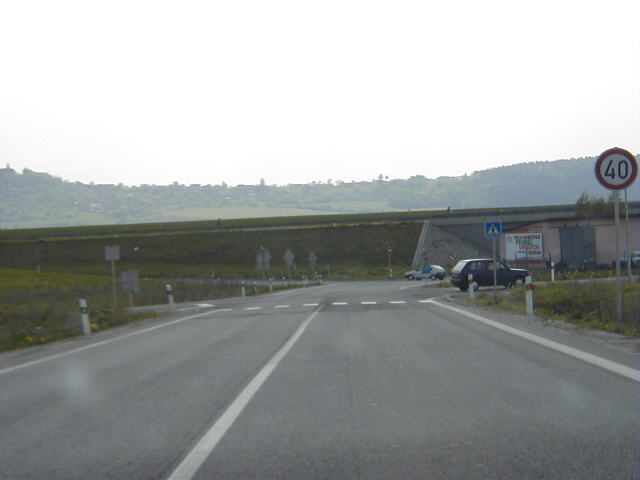 Toto je pohled z vozu těsně před přiblížením se ke křižovatce. Zleva příjezd od Jičína, vpravo směr na Mladou Boleslav. Omezení rychlosti na 40 km/h na hlavním tahu + přechod pro chodce (ve vzdálenosti 30 m od podchodu) jsou na takovémto úseku dosti kritické. Vzadu vlevo příjezd od Hradce. Pokud pokračujete rovně (jedete na Hradec), získáte obvykle před mostem po zatočení mírně vpravo dojem, že jste vjeli obráceně do jednosměrky. (Toto jsme ověřovali u více řidičů, takže se nejedná o subjektivní pocit jednoho člověka.) Nenechte se zmást bílým vozem napříč silnicí – skutečně je napříč, neboť se právě ztratil a otáčí se v křižovatce.